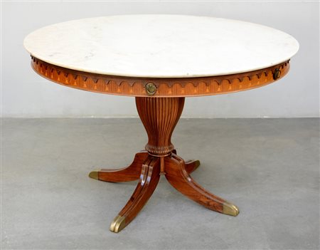Tavolo tondo con fascia intarsiata a motivi vegetali, gamba centrale tornita e scanalata terminante a quattro piedi sagomati con puntali in ottone, piano in marmo. Esecuzione italiana anni 50 (d cm 120x77) (difetti al piano)