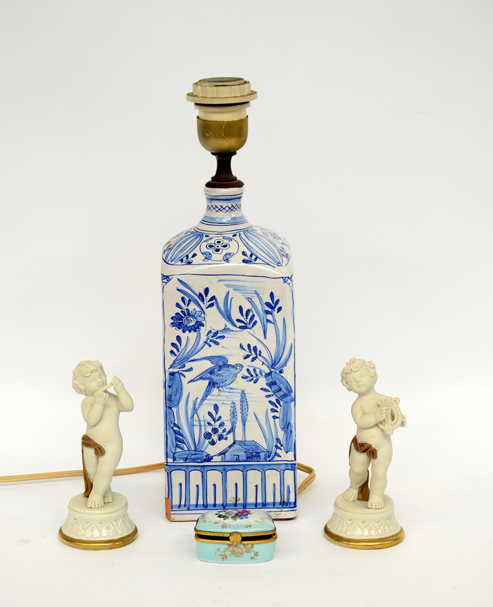 Lotto composto da una lampada da tavolo, una coppia di putti in ceramica e una scatolina con coperchio in porcellana Limoges (difetti)