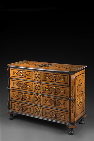 ComÚ lastronato in legni vari, piano intarsiato in ebano a volute e fiori in policromia, fianchi con riserva a paesaggi, fronte a tre cassetti. Lombardo-Veneto, sec. XVIII (cm 130x97x57) (difetti e restauri)