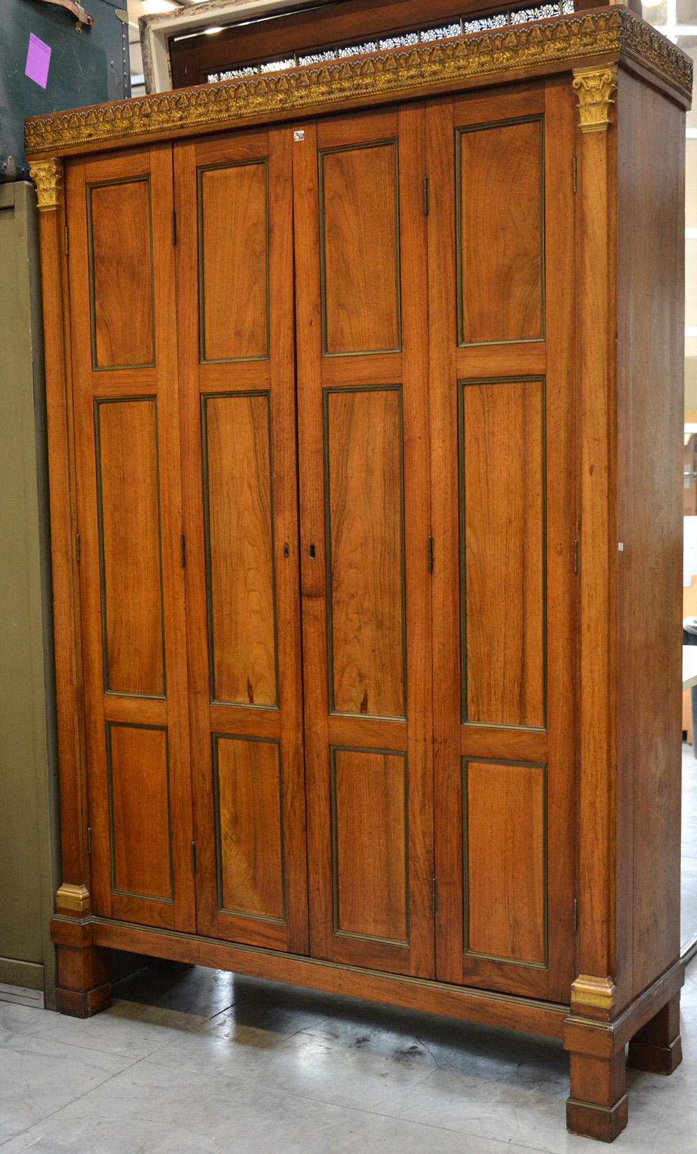 Mobile da archivio due ante a quattro battenti celanti vani a giorno e sportello con serratura. Montanti a mezza colonna squadrata con capitelli intagliati e dorati. Piedi a plinto. Sec. XIX (cm 142x220x42) (difetti e restauri)