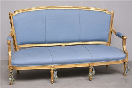 Divano in legno dorato ed intagliato, braccioli a ricciolo, piedi torniti e scanalati (h cm 135) (difetti)