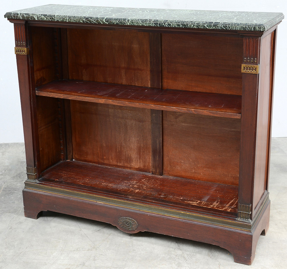 Piccola libreria a due ripiani, montanti a colonna stilizzata con elementi in bronzo, piano in marmo verde Alpi e piedi a mensola (cm 116x100x35) (difetti)