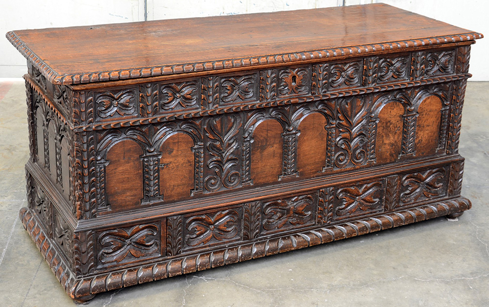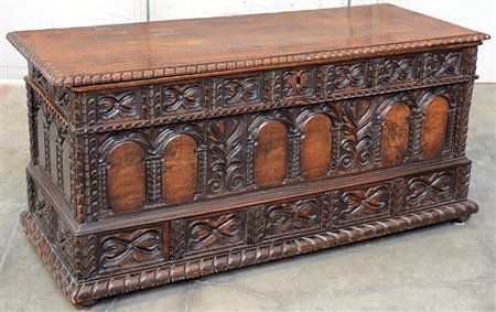 Antica cassapanca spagnola in noce con fronte e fianchi riccamente intagliati a motivi vegetali, fiori, volute e archi (cm 138x65x55)