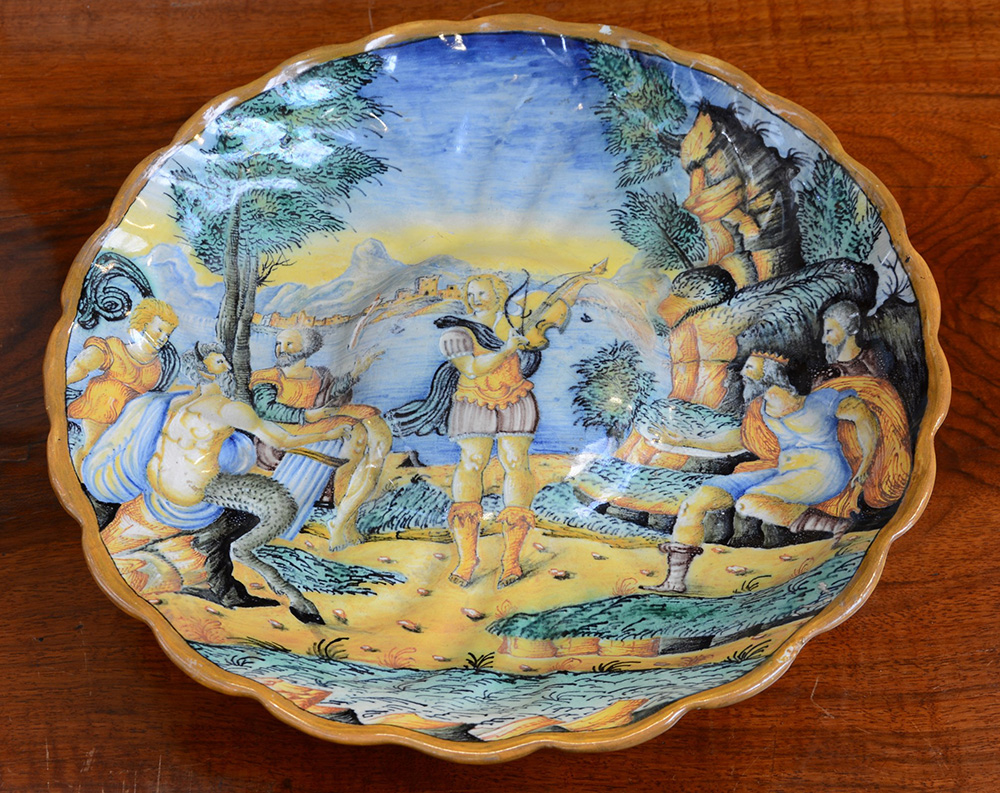 Alzata in ceramica di forma polilobata decorata in policromia a scene mitologiche (d. cm 28) (difetti e restauri)