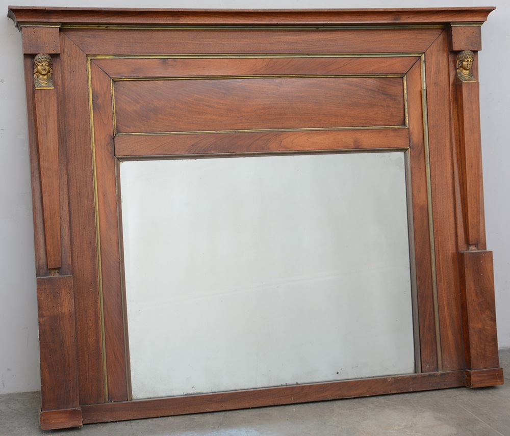 Caminiera in noce decorata con profili in ottone. Montanti a mezza colonna squadrata terminanti con capitelli in bronzo dorato. Sec. XIX (cm 146x117)