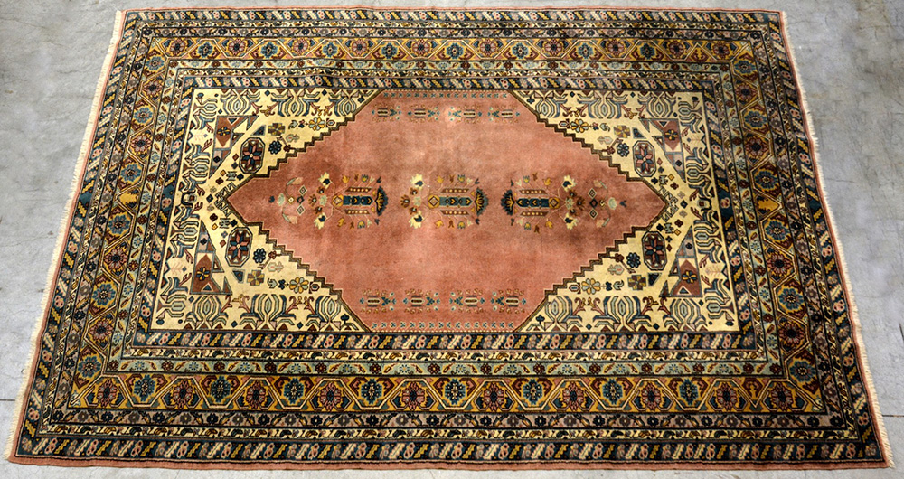 Tappeto Sparta Anatolia sec. XX. Disegno a medaglioni rosa su fondo bianco (cm 288x209) (lievi difetti)