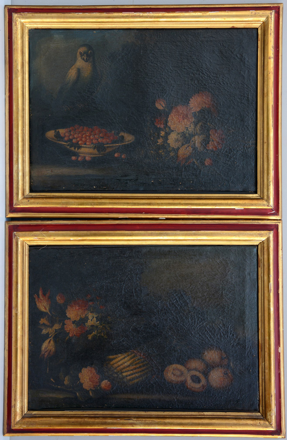 Maestro del secolo XVIII "Natura morta con pappagallo" "Natura morta con fiori, frutta e verdura" coppia di oli su tela ( cm 46x64)In cornice (difetti)