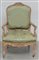 Poltrona in legno intagliato e dorato a volute e fiori. Gambe e braccioli...