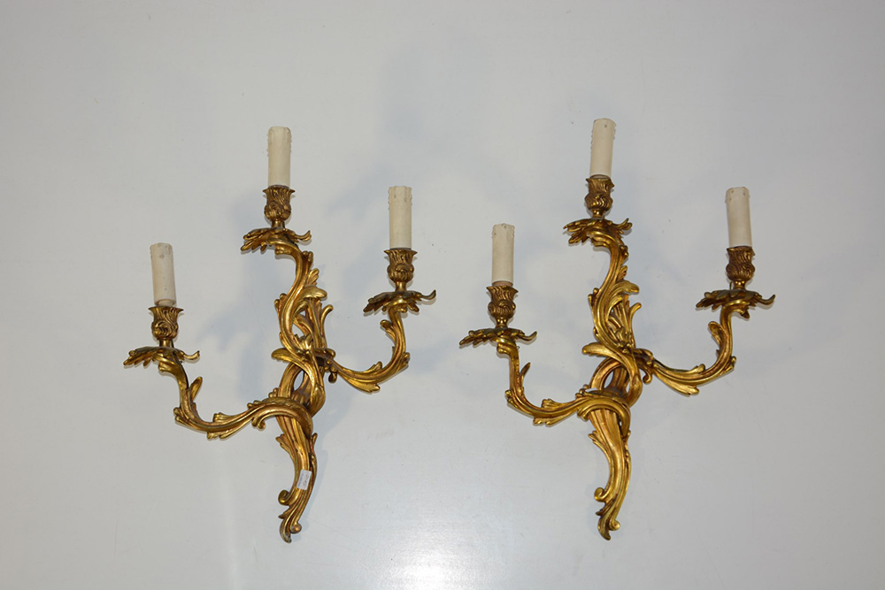 Lotto di due applique in bronzo dorato a tre luci con decoro a racemi (lievi difetti)