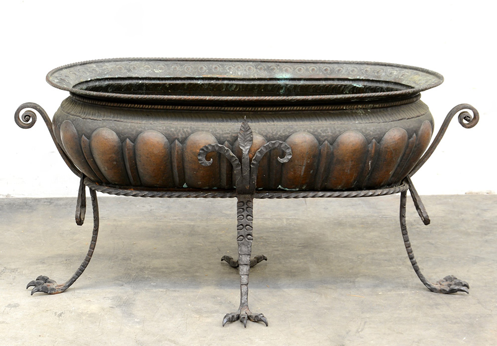 Fioriera ovale con struttura in ferro battuto su piedi a zampa di rapace e vasca in rame baccellato (difetti)