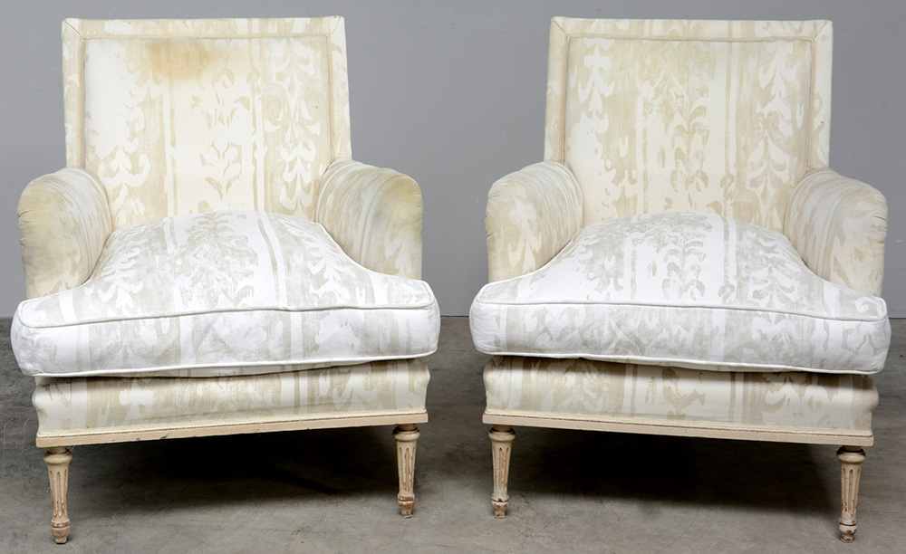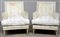 Coppia di poltrone da riposo con gambe stile Luigi XVI con struttura in legno color avorio e rivestite in tessuto ecru (difetti)