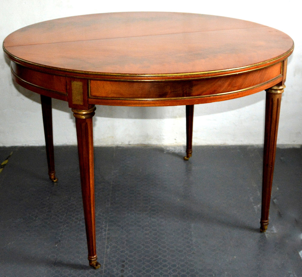Tavolo tondo allungabile in mogano decorato con profili in ottone, gambe tornite e scanalate terminanti con rotelle. Francia sec. XX (munito di prolunga) (cm 120x70)
