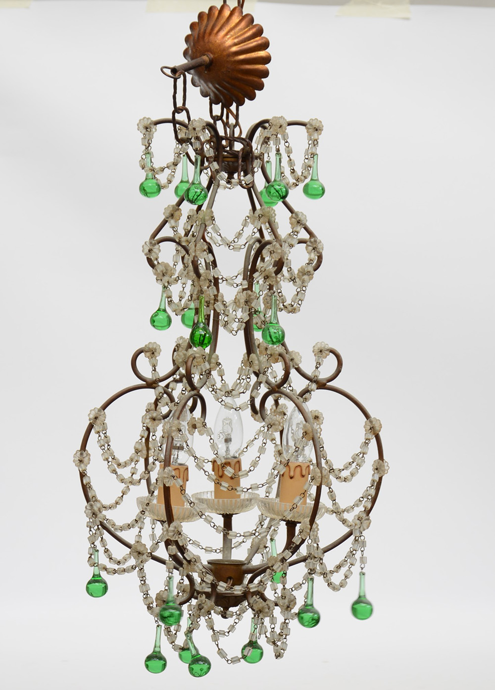 Lampadarietto a tre fiamme con struttura in metallo, perlinature in vetro trasparente e gocce in vetro verde (h. cm 65)
