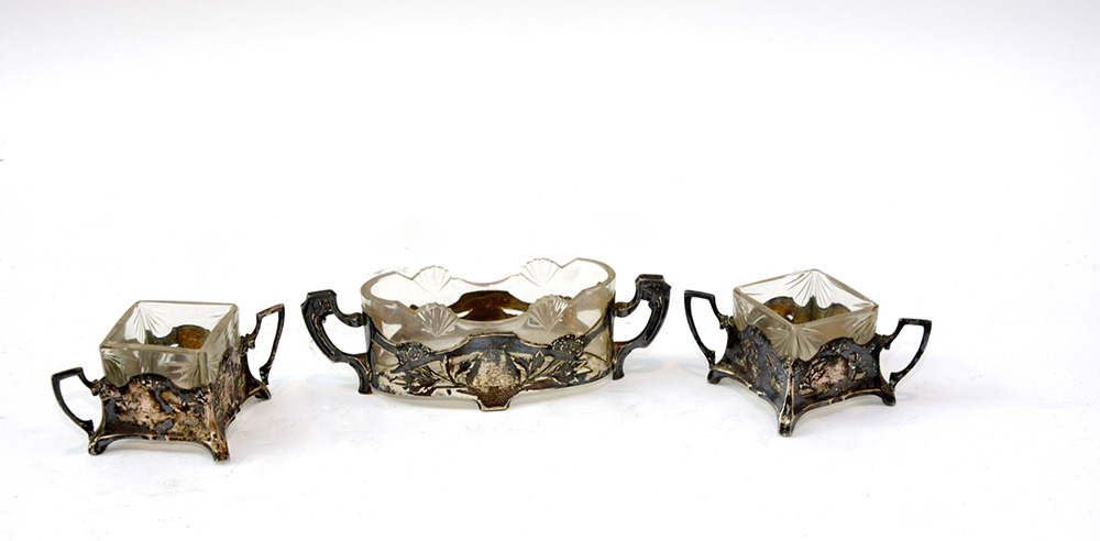 Gruppo di tre saliere in argento decorato a motivi floreali stilizzati con vaschette in vetro molato
