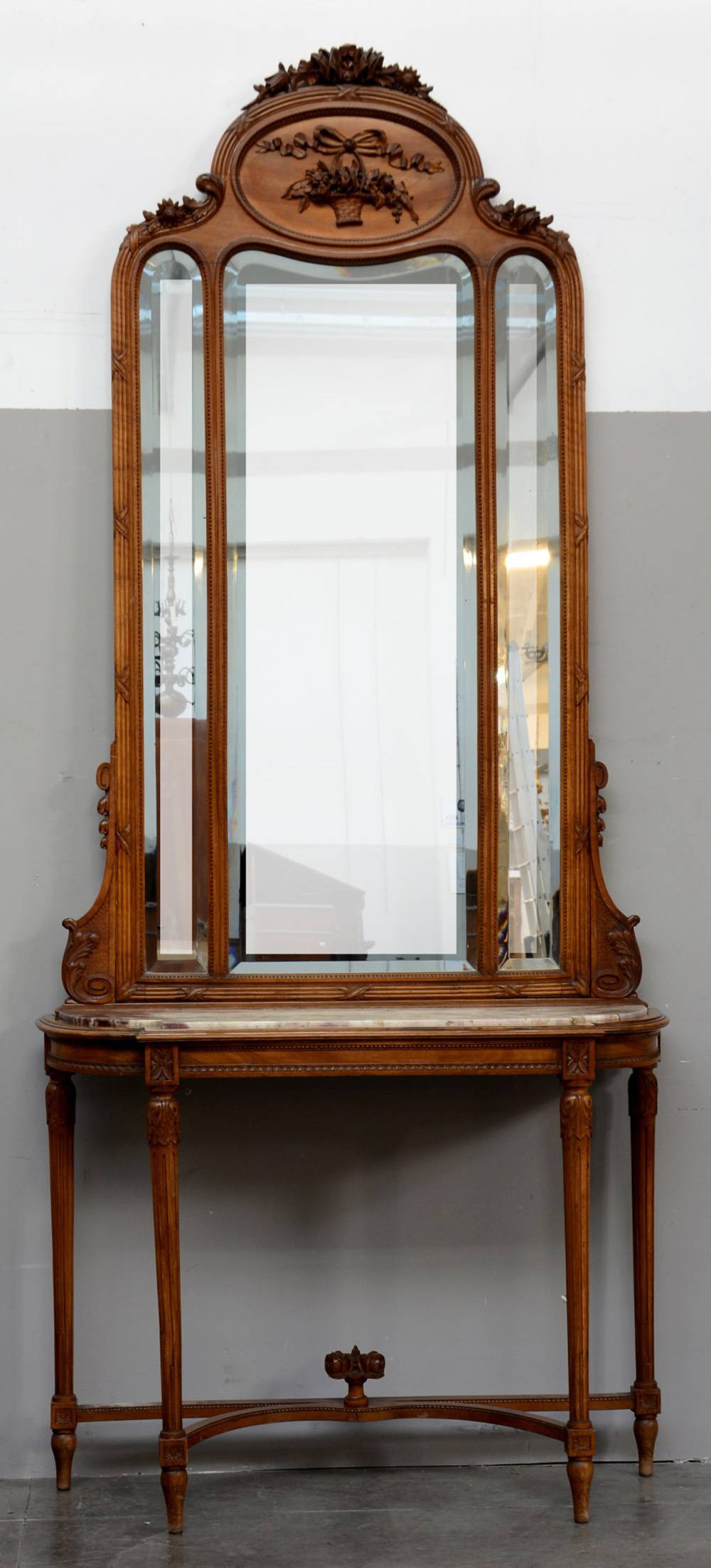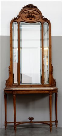 Console in noce stile Luigi XVI intagliato e scolpito con piano in marmo sormontato da specchiera tripartita, sommit‡ decorata con fiori scolpiti (cm 122x280x42 ca) (lievi difetti)