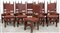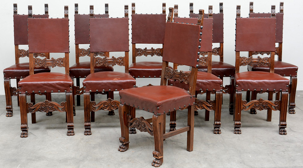 Lotto di dieci sedie in legno con gambe anteriori mosse, piedi ad artiglio e cartelle intagliate, sedute e spalliera rivestite in similpelle (difetti)