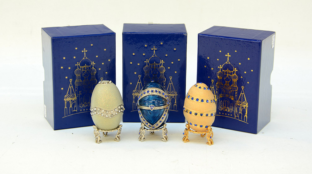 Lotto di tre uova stile FarbergÈ in metallo smaltato e decorato con strass