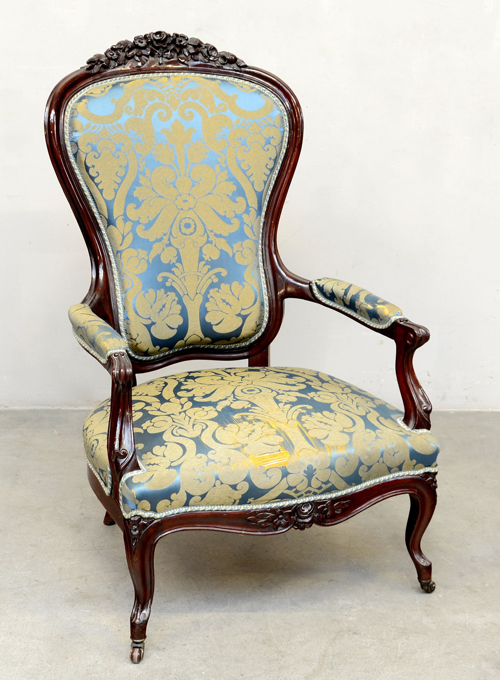 Poltrona di forma sagomata con cimasa intagliata a fiori e foglie, braccioli e gambe sagomate