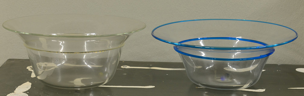 Manifattura di Murano. Lotto di due bacili in vetro incolore con bordo applicato in azzurro e con foglia d'oro. Seconda met‡ del sec. XX (difetti)
