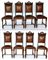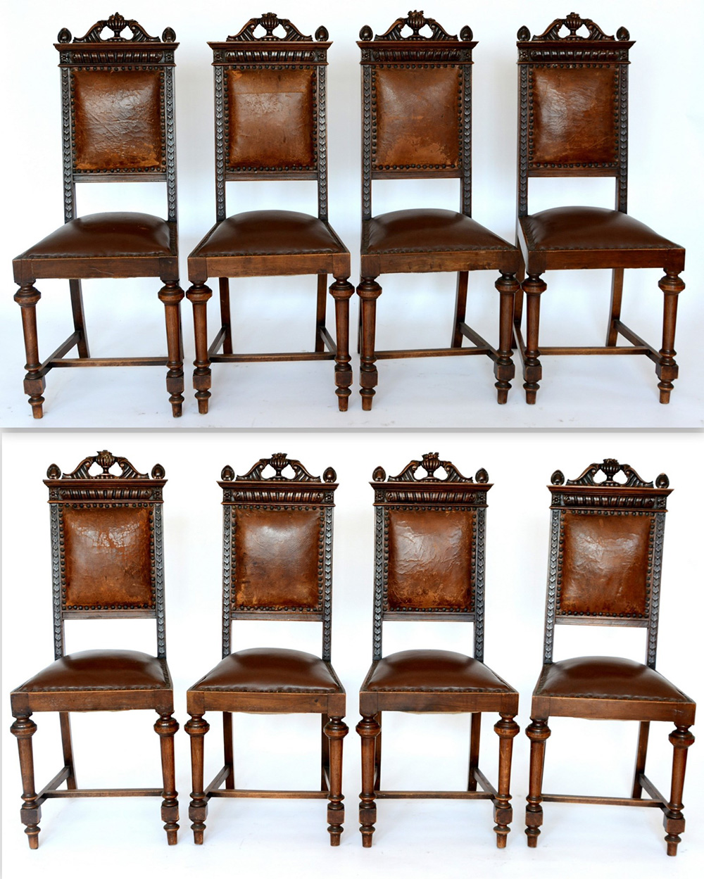 Gruppo di otto sedie in noce con cimasa intagliata e traforata, gambe anteriori tornite. Seduta e schienale in cuoio (difetti)