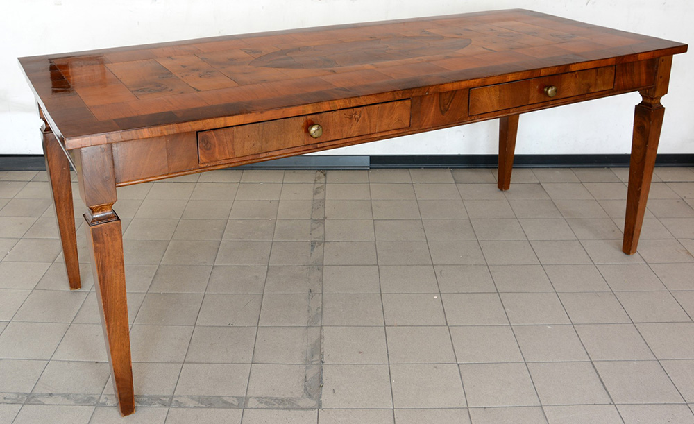 Grande tavolo da centro con due cassetti sottopiano in noce e radica di noce. Con quattro gambe rastremate (cm 200x80x85) (difetti)