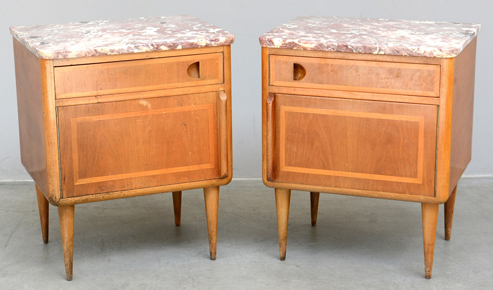 Coppia di comodini ad uníanta ed un cassetto con fronti filettati e piani in marmo. Italia, anni 40 (cm 57x69x43)