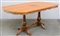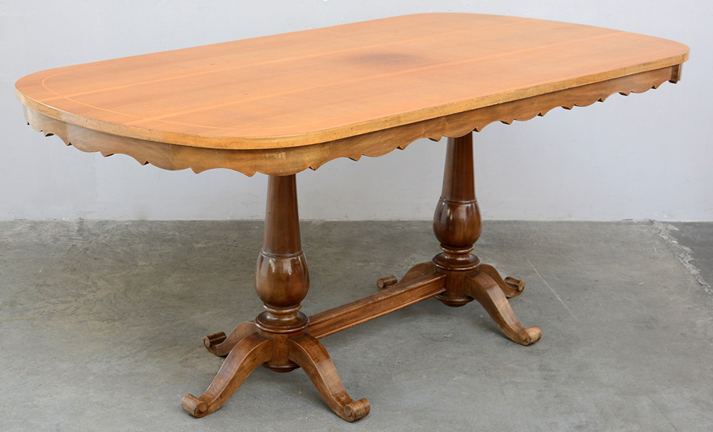 Tavolo di forma ovale con piano filettato e decorato a grembiale sagomato, gambe tornite poggianti su quattro piedi mossi, 1950 ca. (cm 170x77x95) (difetti)