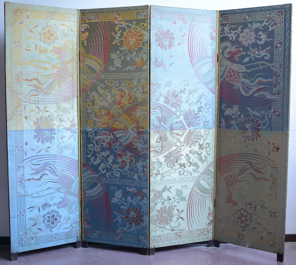 Paravento a quattro ante in seta ricamata con decorazioni di draghi e fenici ( difetti minimi) Cina, XX sec. (198x168 cm.)