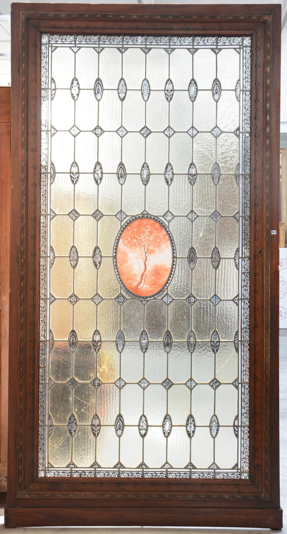Grande vetrata decorata a motivi geometrici e floreali entro cornice (cm totali 241x127) (difetti e mancanze)