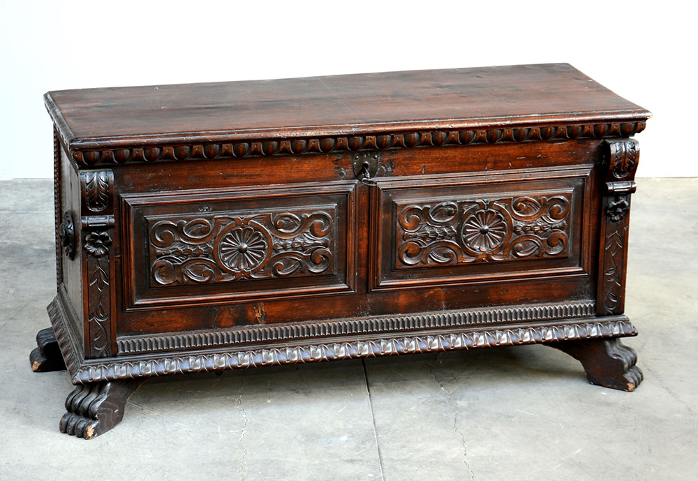 Cassapanca in noce con fronte intagliato a motivi vegetali e rosoni, montanti incisi e scolpiti a pidi ferini (106x55x40)