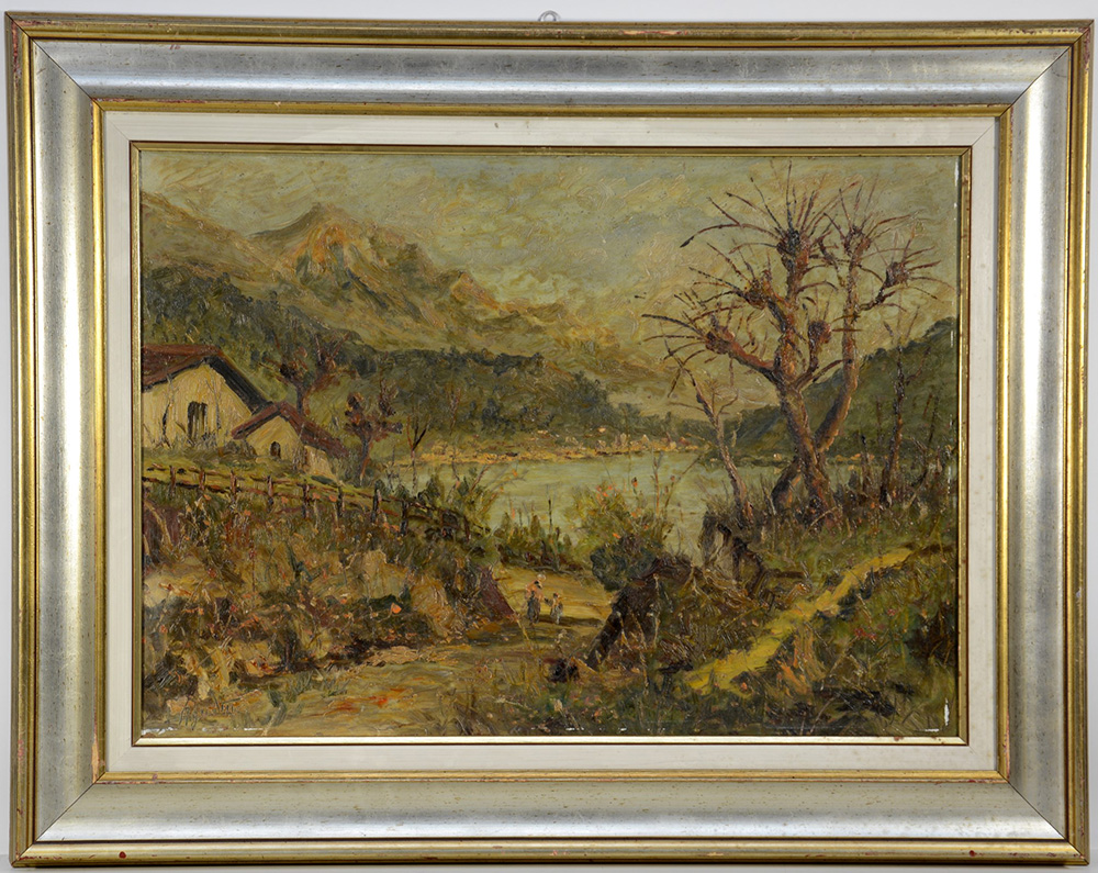 Agnetti Ciro "Lago d'Iseo", olio su masonite (cm 50x70) firmato in basso a sinistra, firmato e titolato al retro, in cornice (difetti)