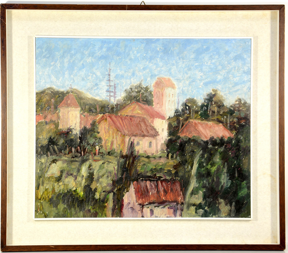 Firma indecifrata, "Paesaggio in Valcamonica", olio su cartone (cm 45x54) firmato, titolato e datato al retro, in cornice (lievi difetti)