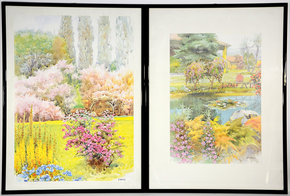 Lotto di due riproduzioni su carta raffiguranti giardini fioriti (misura...