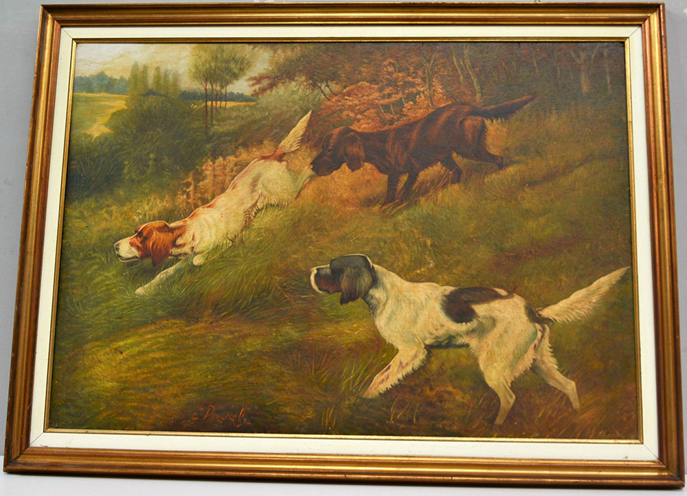 E. Vimercati "La caccia", olio su masonite (cm 70x100) firmato in basso a sinistra, in cornice (lievi difetti)