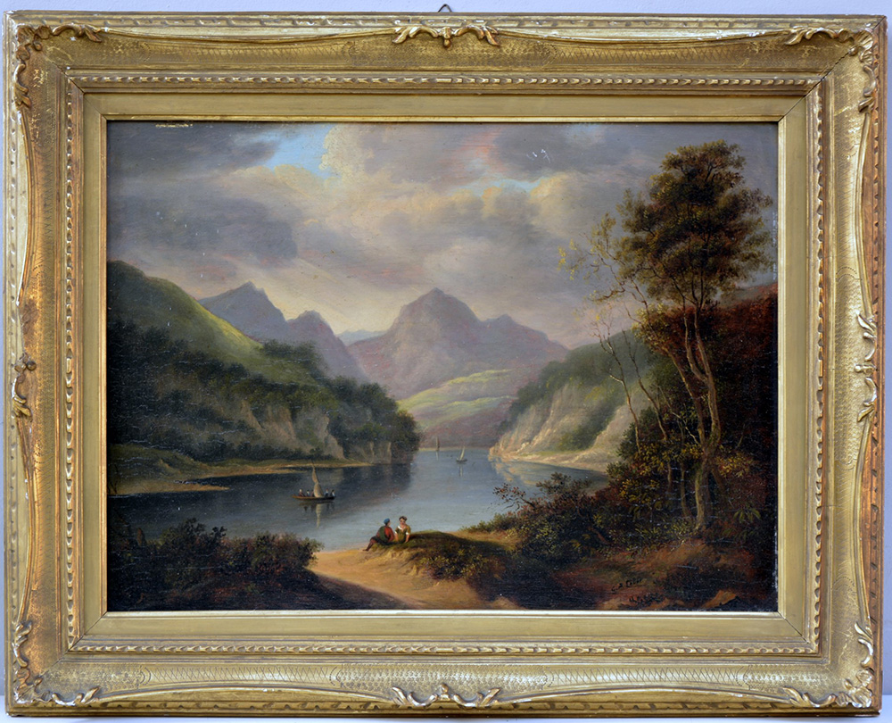 Scuola del sec. XIX. "Scorcio di lago con figure", olio su compensato (cm 45x60). Reca la firma G. B. Lelli in basso a destra. In cornice