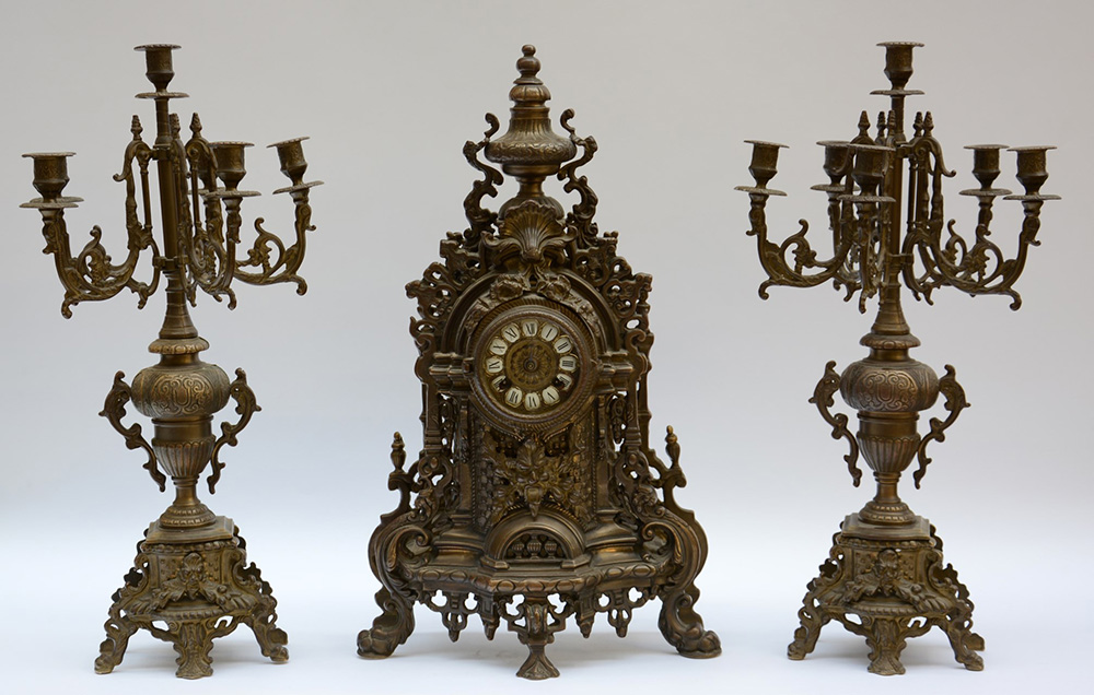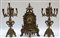 Trittico da camino in metallo dorato composto da pendola con quadrante a numeri romani e una coppia di candelieri a quattro fiamme con fusto a forma di vaso, decorati a motivi vegetali e mascheroni (h cm 60)(lievi difetti)