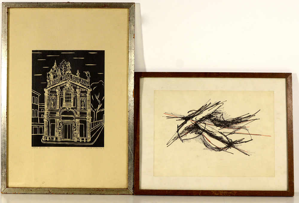 Lotto composto da una grafica di Sante Visco raffigurante una chiesa e un bozzetto a pennarello con firma indecifrata, in cornici (difetti)