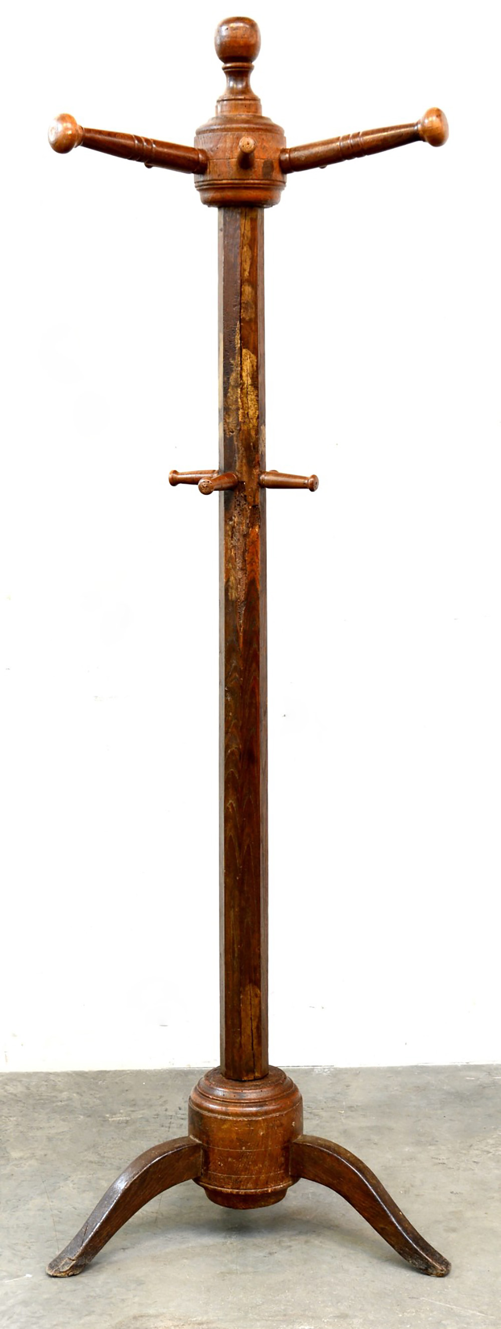 Appendiabiti in legno a base tripode con colonna sfaccettata e grucce tornite, sec. XIX (h cm 186) (difetti)
