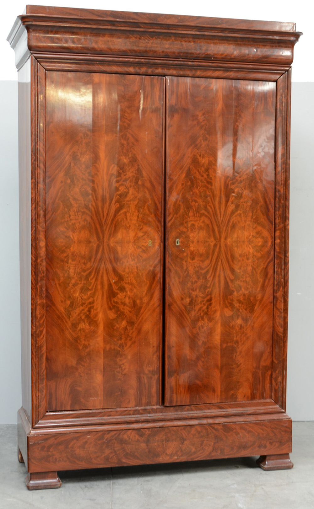 Armadio a due ante in mogano e piuma di mogano ad un cassetto nella base. Francia sec. XIX (cm 140x220x60)