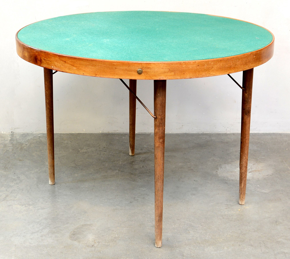 Tavolo da gioco tondo con gambe richiudibili e piano rivestito in panno verde. Italia, sec XX (d cm 110, h cm 76,5) (difetti)