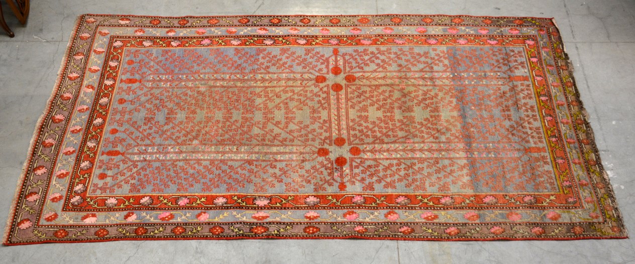 Tappeto Samarkanda, Turkestan orientale secolo XX. Disegno ad alberi della vita e melograni su fondo azzurro (cm 360x183) (difetti)
