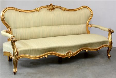 Divano in legno dorato con schienale sagomato e intagliato, braccioli,...