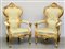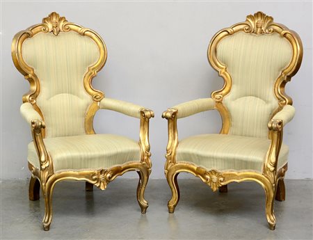 Coppia di poltrone in legno dorato con schienale sagomato e intagliato,...