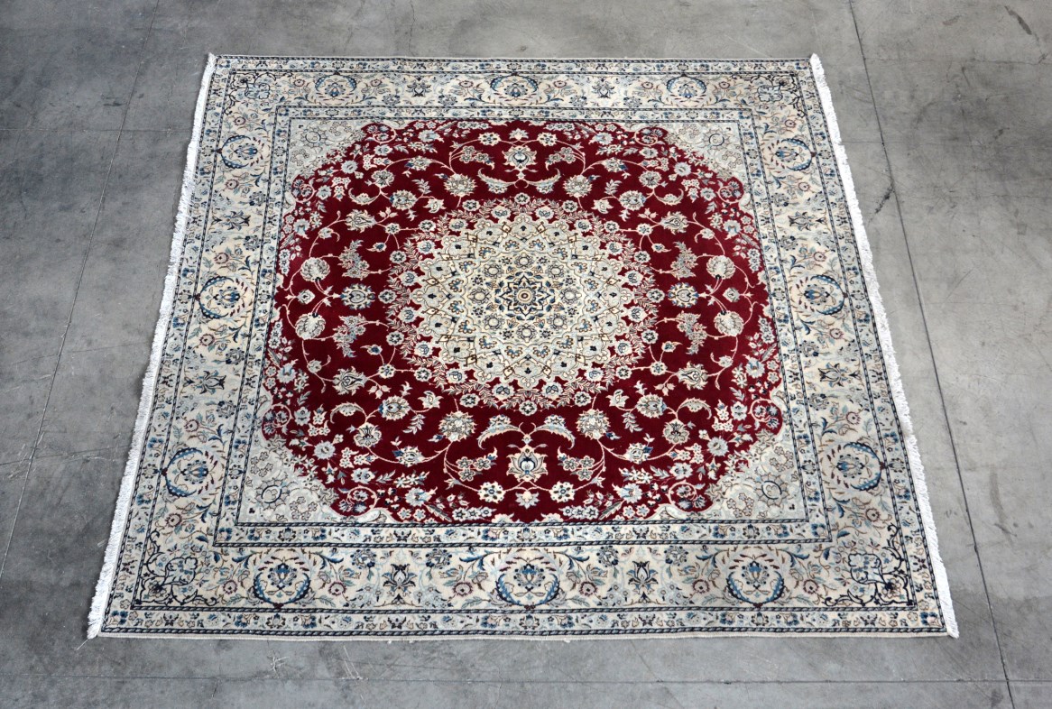 Tappeto Naim. Persia secolo XX. Disegno a medaglione color panna su fondo rubino (cm 246x247) (lievi difetti)