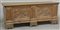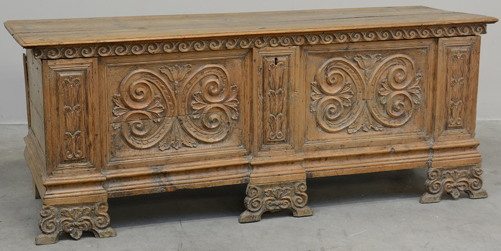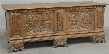 Cassapanca in legno con fronte scolpito a motivi vegetali, foglie e riccioli. Piedi sagomati. Sec. XVII (cm 186x72x61)(difetti e restauri) Provenienza: Ca' del Fogher, Cortina. Progettata dall' Architetto Pier Giulio Magistretti.