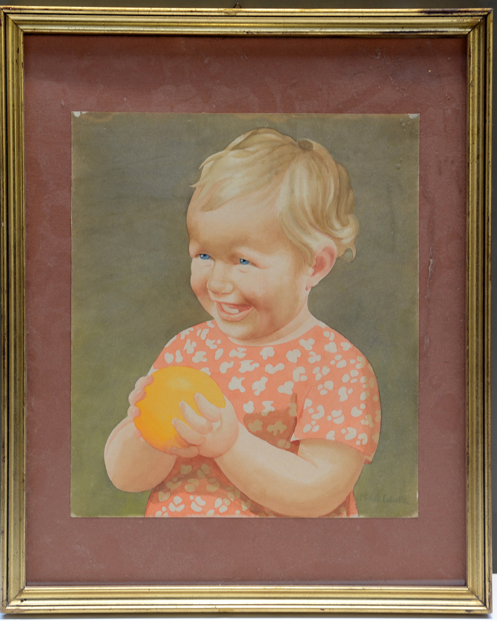 Ignoto "Bambino con palla" tecnica mista su carta (cm 36x31) recante firma Michele Cascella in basso aa destra. In cornice