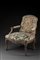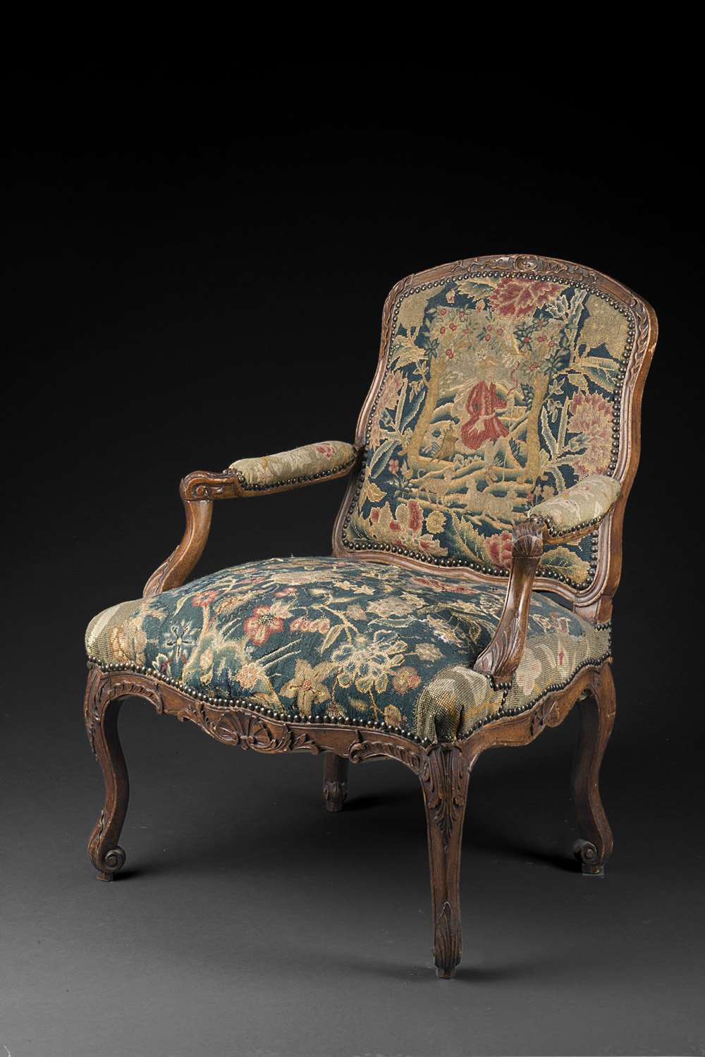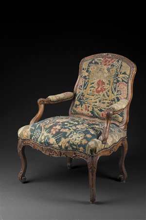 Poltrona in legno con schienale e braccioli sagomati e intagliati a foglie e volute fogliate. Fasce e gambe mosse decorate a motivi vegetali e valve di conchiglia. Piedi a ricciolo. Rivestita in tessuto a piccolo punto a fiori e scena di caccia. Sec. XVIII (difetti e restauri al tessuto)