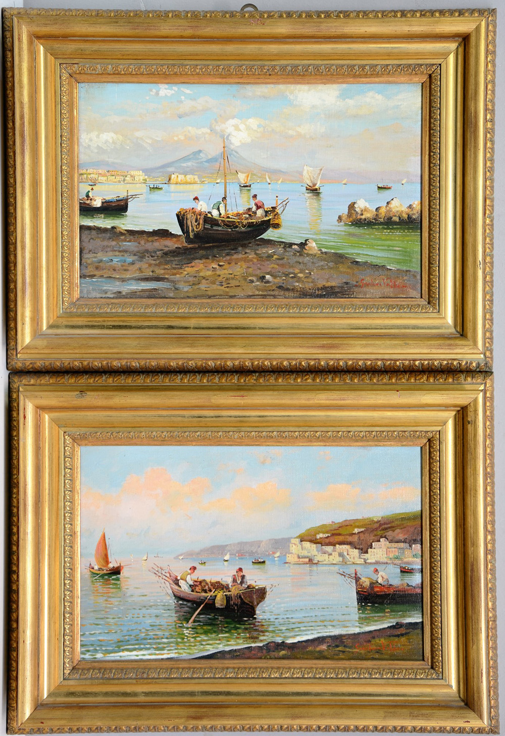Firma indecifrata, "Golfo di Napoli", coppia di olii su tela (cm 25x40) firmato in basso a destra, in cornici