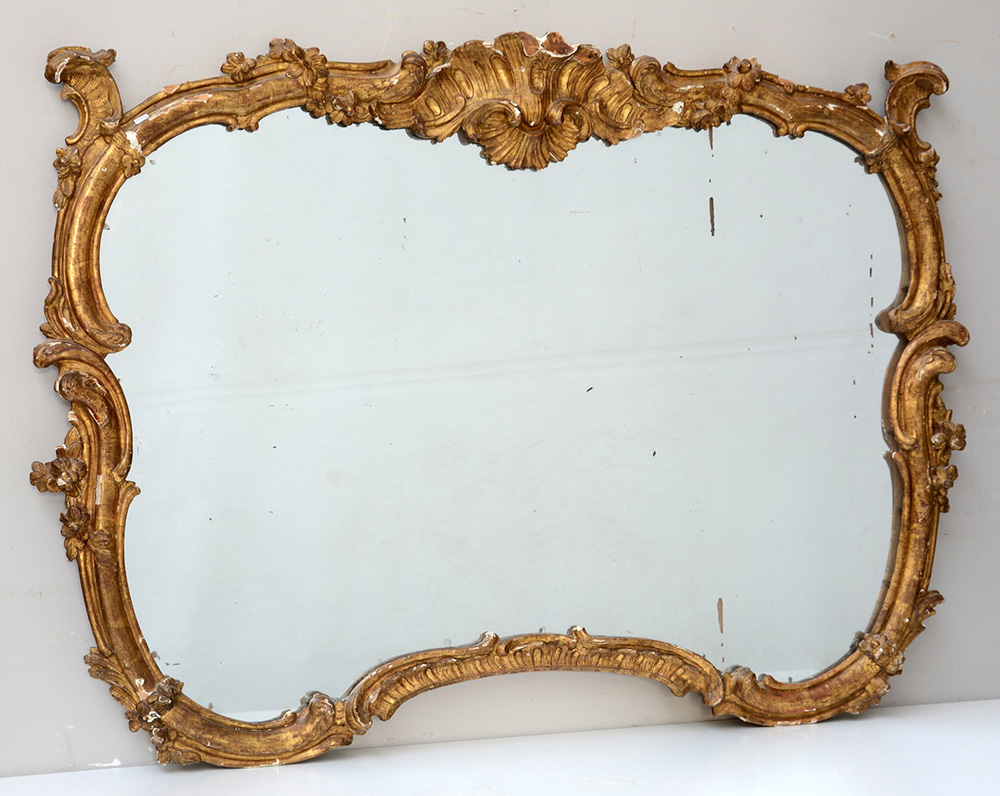 Specchiera di forma mossa in legno dorato intagliata a volute e motivi floreali (cm 82x113) (difetti e mancanze)