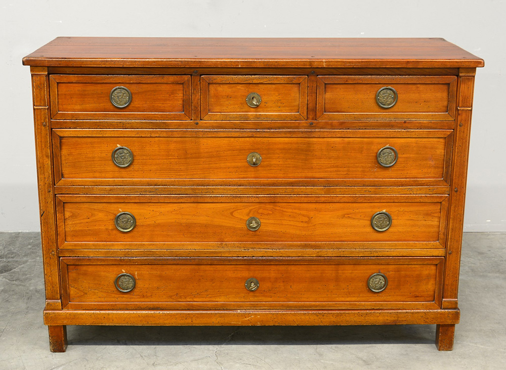 Cassettone a tre cassetti in linea sottopiano e tre grandi sul fronte, piedi dritti (cm 133x92x50)